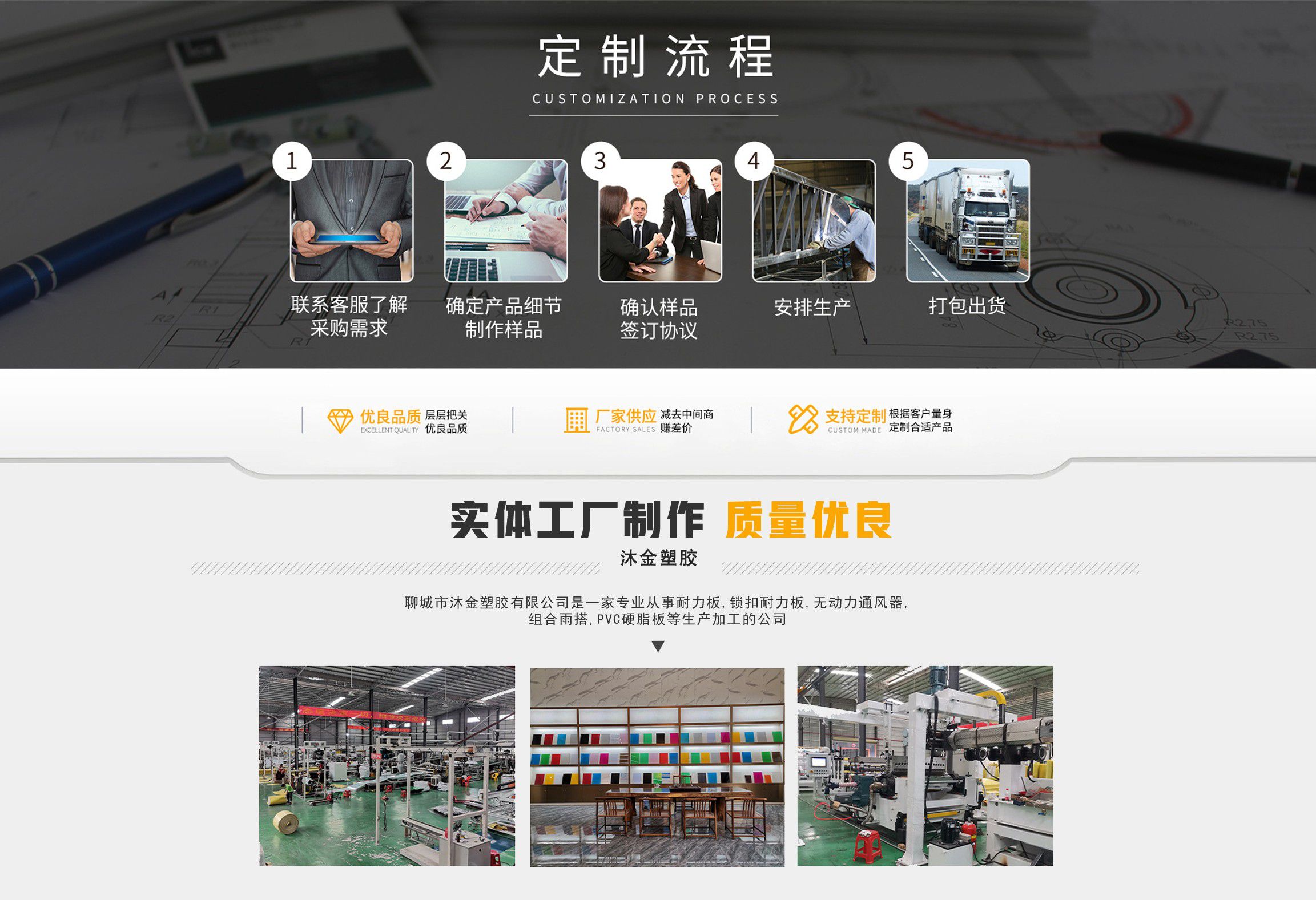 聊城市沐金塑膠有限公司注冊(cè)資金2180萬元,占地20000余平方,擁有自建廠房15000平方,員工100余名。10余年來,公司主營(yíng)耐力板,鎖扣耐力板,耐力板深加工,無動(dòng)力通風(fēng)器,組合雨搭,PVC硬脂板,耐力板廠家等板材的發(fā)展戰(zhàn)略,逐漸成長(zhǎng)為綜合性企業(yè)。 公司擁有多條板材共擠生產(chǎn)線,采用世界知名品牌進(jìn)口原材料和先進(jìn)工藝,依據(jù)完善的ISO9001質(zhì)量管理體系和ISO14001環(huán)境管理體系,為產(chǎn)品的卓越品質(zhì)提供了強(qiáng)有力的保證。憑借過硬的創(chuàng)新能力和堅(jiān)實(shí)的硬件基礎(chǔ),贏創(chuàng)已成為國(guó)內(nèi)領(lǐng)先的熱塑性板材生產(chǎn)商,產(chǎn)品被廣泛應(yīng)用于建筑業(yè)、農(nóng)業(yè)、工業(yè)、廣告業(yè)、安防行業(yè)及DIY領(lǐng)域?! 」臼冀K致力于通過提供最優(yōu)的板材應(yīng)用解決方案,為客戶創(chuàng)造最高的價(jià)值;堅(jiān)守創(chuàng)新、質(zhì)量、靈活、服務(wù)和速度的核心價(jià)值觀;堅(jiān)持“完美的產(chǎn)品需要完美服務(wù)的支持”的經(jīng)營(yíng)理念,努力實(shí)現(xiàn)成為世界領(lǐng)先的板材與解決方案供應(yīng)商的夢(mèng)想。 在未來,公司將立足客戶需求,不斷改變和完善現(xiàn)有產(chǎn)品,拓展產(chǎn)品線和充分開發(fā)板材的應(yīng)用領(lǐng)域,為客戶創(chuàng)造全方位的價(jià)值。同時(shí)更好地實(shí)現(xiàn)員工的價(jià)值,實(shí)現(xiàn)公司團(tuán)隊(duì)的價(jià)值。我們將與您一起創(chuàng)贏未來! 企業(yè)使命:成為世界領(lǐng)先的板材與解決方案供應(yīng)商?! 」驹妇埃和ㄟ^提供最優(yōu)的板材應(yīng)用解決方案,為客戶創(chuàng)造最高的價(jià)值?! 『诵膬r(jià)值觀:質(zhì)量...